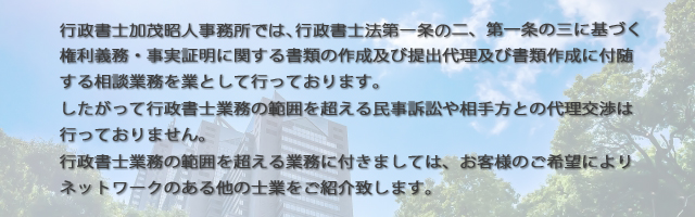 行政書士 加茂昭人事務所の業務案内です。下記が業務が対応可能となりますので、お気軽にご相談ください。下記以外の業務についてもご相談ください。
