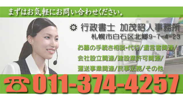 札幌市白石区の行政書士 加茂昭人事務所です。お墓の手続きから、会社設立・建設・運送・民事法務などお気軽にご相談ください。
